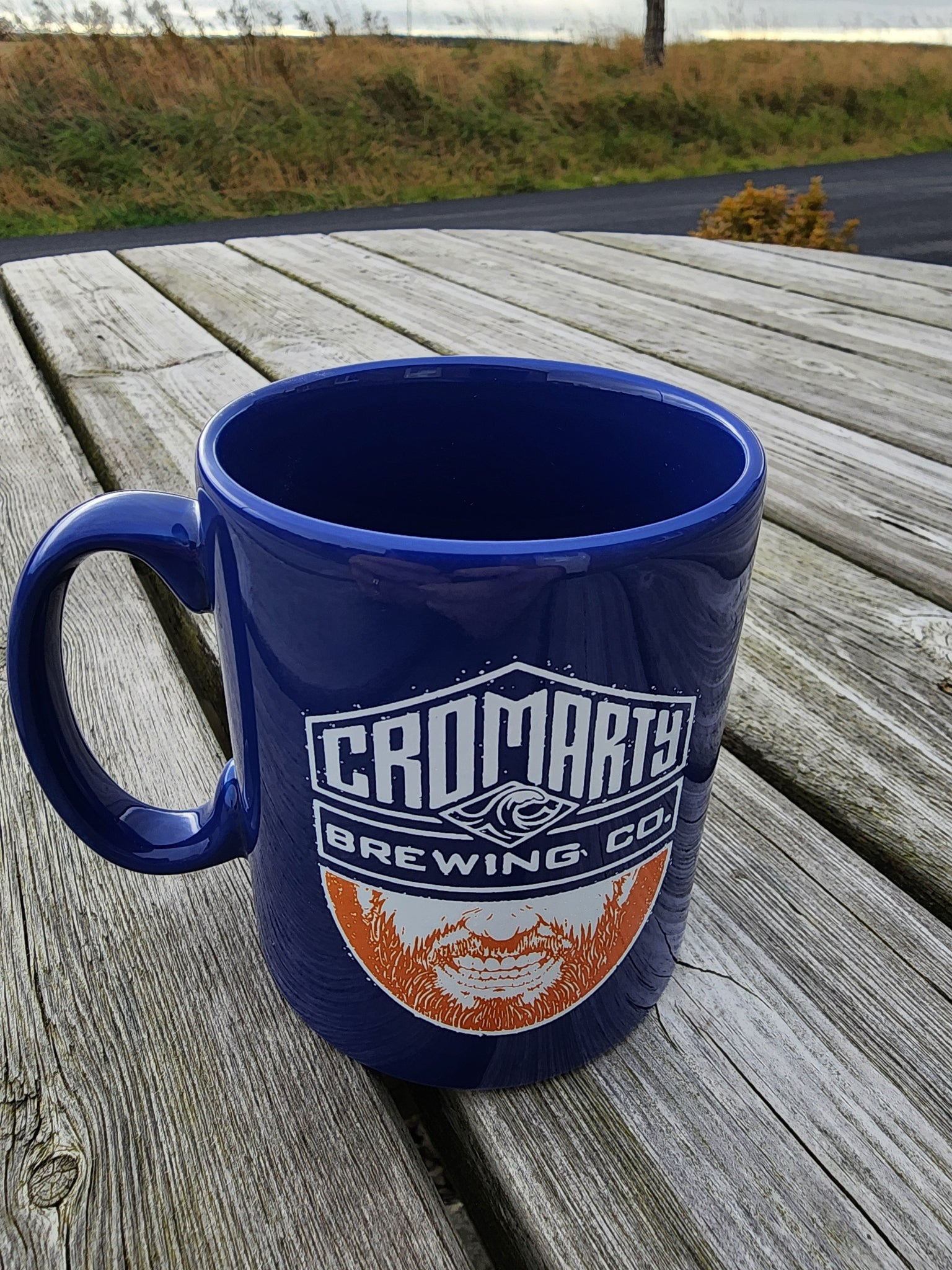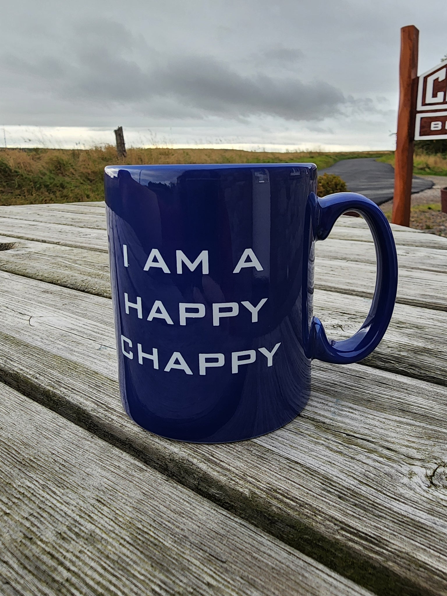 Royal Blue ceramic mug printed with white Cromarty Brewing Co Logo and orange Happy Chappy image on front, 'I AM A HAPPY CHAPPY' on the back.